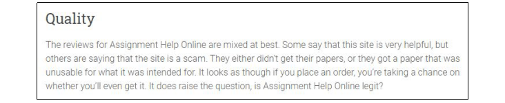 | Evidently, the website lacks a lot of elements that the students look for in an assignment writing company. Even though the website has potential, they haven’t been able to deliver. At least, that’s what the reviews suggest. However, there are several students who have found the services of the Assignmenthelponline.co.uk to be satisfying. So, if you still place an order at the website, just make sure you have a backup plan in mind. |