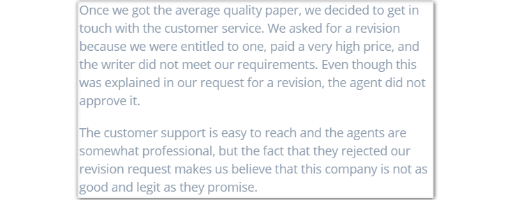 Img source: www.ukessaysreviews.com The review highlights that the customer support team from this website is not cooperative even though they’re accessible. The review explains the site might be fake because they refused to send the tasks for a revision. |