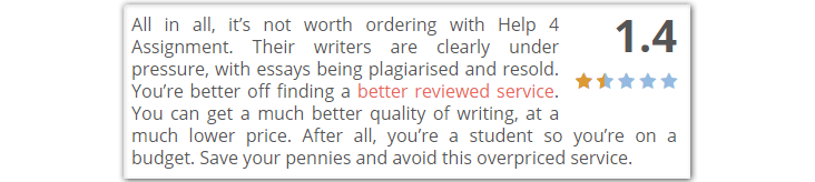 Help4Assignment.co.uk complaints- 'rework is very much hectic', 'not match with uni standard', and 'Mosaic Plagiarism'. Consequently, Help4Assignment has a below rating of 2 stars out of 5 indicating that Help4Assignment is not reliable and not worth your money. For this reason, students are not satisfied with them. Lastly, Help4Assignment's expert does not have knowledge that matches the Uni standards.