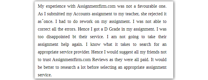 I was extremely happy and relieved with the fact that I could find a service provider to delegate my urgent tasks. The customer support team of assignmentfirm.com explained how they carry out the entire process of writing academic papers. Even though I have complaints regarding the quality of my assignment, I'd like point out that their price packages are a bit confusing and I ended up paying extra for the services I availed. That was really uncalled for.
