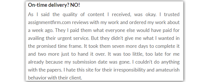 | In conclusion, it is safe to assume that AssignmentFirm.com is not the kind of academic service provider that you should rely on when your grades are at stake. Furthermore, if you are paying money for assistance, you should get all the exclusive features, which they do not provide. Moreover, they do not provide on-time delivery, and they even refuse to cooperate when the student is in a dire situation. Thus, you should refrain from availing assistance from AssignmentFirm.com. |