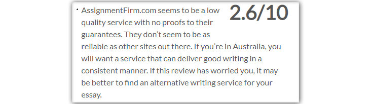| AssignmentFirm.com states that they offer 24*7 student-friendly customer care support. The support team always clears the doubts of the students. And as far as refund policy is concerned, they did not provide any details on their website. Img source: www.bestaustralianwriters.com Time for a reality check. AssignmentFirm.com is not a reliable educational service provider, as is evident from the review provided above. They do not stick to their word, and they fail to provide the customer experience that the students deserve. |