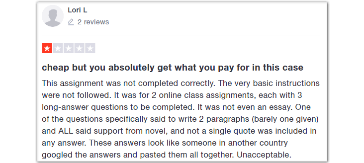 | The website claims that the site has 500+ degree-holding writers. But one look at the writers’ profiles arises many questions. You will not find any details that divulge the qualifications of the writers. Moreover, the papers delivered by the site have not garnered positive reviews either, thus making the site seem to be a scam. Below is an excerpt, where Lori says that the charges may be cheap, but the content delivered is equally cheap. |
