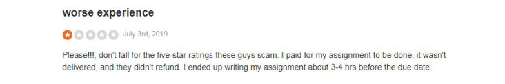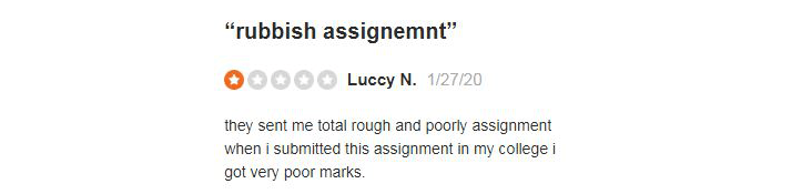 Assignmenthelp4me complaints- 'incorrect in-text citations', 'rubbish assignment quality', 'poor writing skills', 'bunch of lazy people'. Consequently, Assignmenthelp4me has a below rating of 2 stars out of 5 indicating that Assignmenthelp4me is not reliable and not worth your money. For this reason, students are not satisfied and mark them as 'crooks and scammers'.