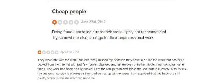 They were late with the work, and after they missed my deadline they have send me the work that has been copied from the internet with just few names changed and sentences cut in the middle, not making sense at times. The work has been clearly copied. I am the real person and this is the real truth-full review. Also its true the customer service is playing on time and comes up with excuses. I am suprised that this business still exists, where is the law when we need it?.