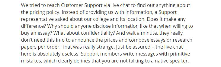| It's vital for academic service providers to have responsive customer support and a clear revision and refund policy and Australianassignmenthelp.com is no exception. The website mentions that offers 24x7 live customer support and free revisions to students. However, there is no mention whether the service provider offers a refund or not. Source: Essayontime.com.au The review explains how the live chat support offered by the website is anything but responsive. Another information shared in the review was that the support team asked for the personal details of the student, which indicates that they don't maintain confidentiality while dealing with the clients. So, it’s quite possible for students to perceive that the services of the website are a scam. |