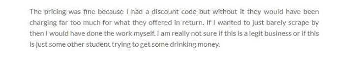 They are like a mixed bag of good and bad points. Some of the things about them were great – good delivery timing, great customer care. But some weren't like poorly done assignment and sky high prices.