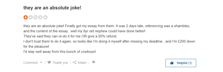 | The website sounds convincing when it comes to the aspect of timely delivery of essays or assignments. Let’s find out how much truth lies in their words. Here is one of the Customessays.co.uk review: Source: sitejabber.com We all know how important it is for students to submit assignments on time. But these so-called professionals leave their clients hanging. According to the second review, even after two days, the referencing list was inaccurate, and the content quality was poor. Customessays.co.uk does not stand as a legal company since they cannot stick to their words. |