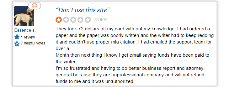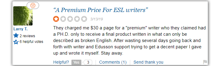 | Edusson.com claims that they offer 24* 7 customer support executive and they opened the option for chat facility for students. Moreover, the academic service provider states they provide refunds if the order is cancelled or students find any error in the document. But the reality is different. According to reviewing website, the customer support executives are not always available, and they were even impolite in several cases. Here is a review of one of the customer: Img source: www.sitejabber.org |