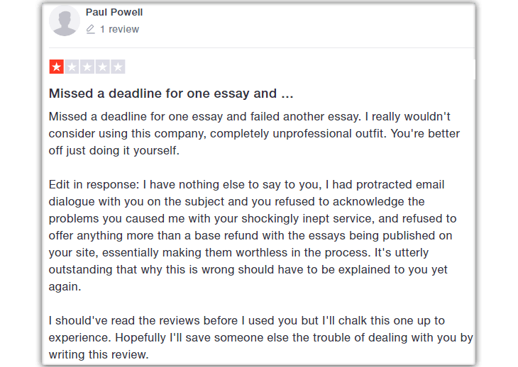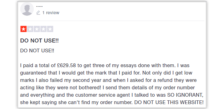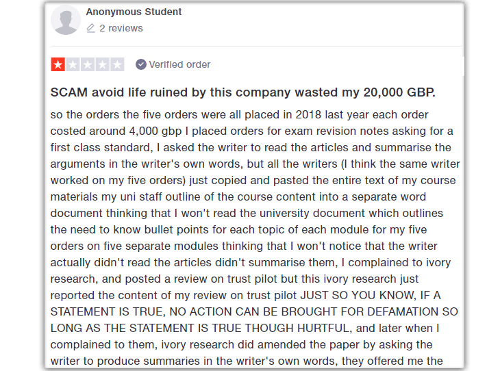 |   As per IvoryResearch.com, they provide 24*7 online chat support, and the students are allowed to call if they face issues. Moreover, the students can place their questions via mail. In addition to this, the academic service provider says that they provide refunds if there is an error in the payment, or if there is a cancellation of the order placed etc. Action speaks louder than words. IvoryResearch.com does not stick to what they claim on their website. Thus, they are not reliable. The customer executives do not cooperate properly, and they are even rude on several occasions. Furthermore, IvoryResearch.com does not refund the client’s (student’s) money even when the student has genuine reasons to ask for a refund. Hence, the service offered by IvoryResearch.com can be construed as fake. Now let us have a look at one of the student review.   Source: www.trustpilot.com  |