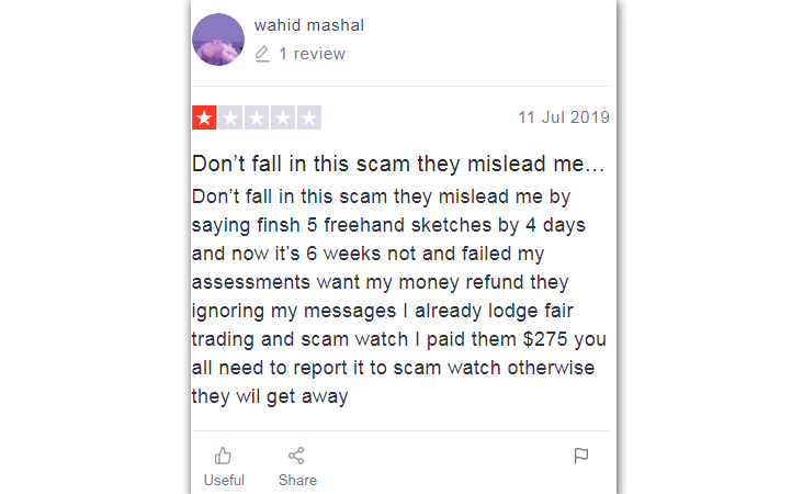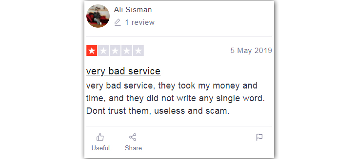 | The company initially claimed to accept payments via secured transactional gateways and online banking. So, we were of the opinion that the brand would surely prioritise the aspect of “secured” transaction. The other side of the coin revealed a different truth altogether. The firm isn’t at all reliable in terms of secured payment and transaction. Our demo assignment is yet to be delivered, and no wonder the payment has already been made. It’s been more than a month now. Here are a couple of screenshots that turned our scepticism into harsh reality. Source: www.au.trustpilot.com |