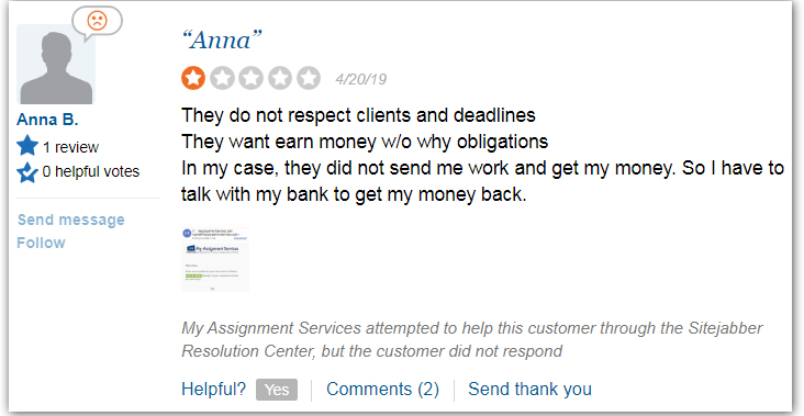 | Highlights: MyAssignmentServices complaints- 'worthless writing quality', 'terrible quality', 'missing deadlines', and 'wrong work' . Consequently, My Assignment Services review has a below rating of 2 stars out of 5 indicating that MyAssignmentServices is not reliable and not worth your money. For this reason, students are not satisfied, call them "liars and fraud". |
