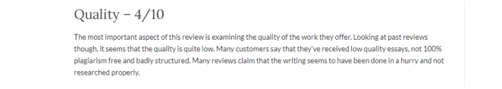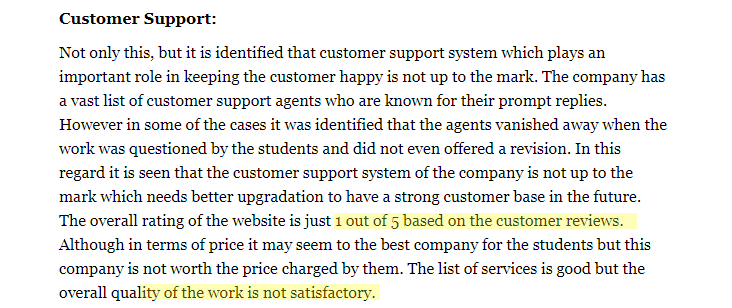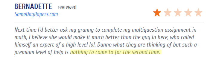 |   SameDayPapers.com say that they offer high quality, and original assignment writing services, coupled with thorough checking and proofreading services. Right when you click-open the website, the attribute of quality assignment providing facility be a focus for the eyes. This is not all; guarantees like plagiarism-free guarantee, professional writers working to ensure quality and immediate support are brought into consideration to prove the legitimacy of the assignment they create for students. However, the following screenshot from a reputed website stands tall to prove that all claims by SameDayPapers.com are not trustworthy. After researching a bit across the internet, we would say to the students asking ‘is SameDayPapers.com safe to buy or worth buying,’ try and avoid this website. As we have found out, it's not a highly efficient virtual platform to seek academic assistance. Though the company provides a wide variety of essay writing services, the prices of SameDayPapers.com do not match quality. The example that we have given above, and the others we have found on the internet, the website is definitely not a place to spend hard-earned money.  |