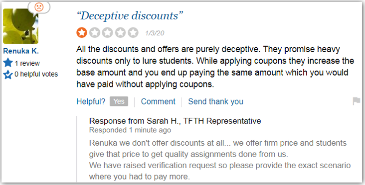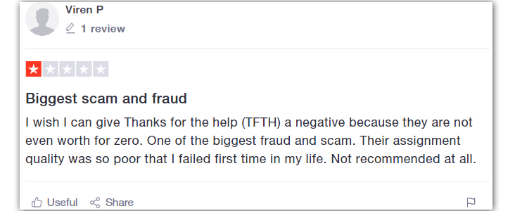 | On the homepage of Thanksforthehelp.com’s website, you will see that they have a 4.9 out of 5 stars rating. Their rating, however, is unreal and imaginary, as reflected from the reviews about them on multiple reviewing forums. In the following screenshot of one such review, the client terms them as a fraudulent company. He also accuses the company for making him fail a grade, thus showing that the assignments delivered are not up to the mark at all. |