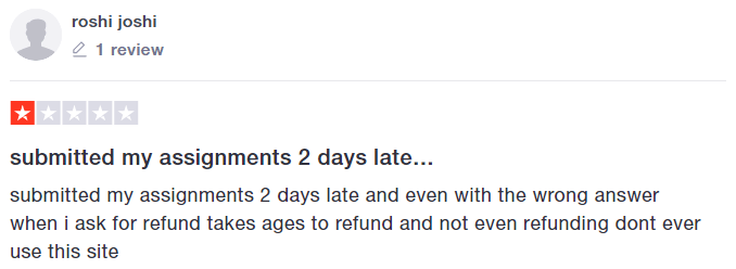 | However well-written may the assignment be, there is no point of the quality if it is not submitted before the deadline. Academic sites therefore must be extremely professional about punctuality. When it comes to this site, their claim about timely delivery is not a clean slate, with many students complaining about their delayed delivery. In the screenshot provided below, the student says that the delivery was not only delayed but cancelled at last moment. This proves that their business practices are completely unethical when it comes to timeliness. |