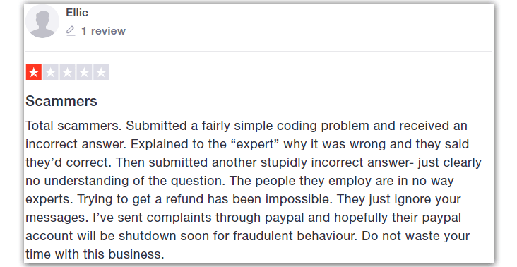 | On the website, you will see that they have claimed that they use highly secured and reliable payment gateways. We have gone through many reviews about their payment services and students have complained about fraudulent being happened to them. In this review also, the student calls them “scammers”. The student writes that they ignore messages and their payment gateway is spurious. Their refund policy is very vague too and it is impossible to get a refund from them. |
