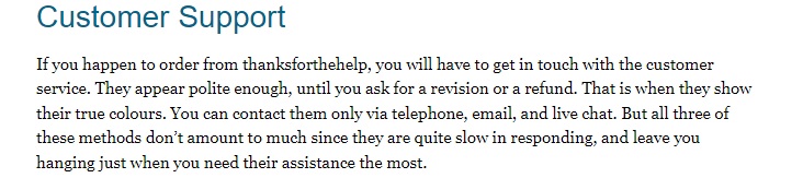 Source: https://myassignments-help.com.au/thanksforthehelp-review/ Customer support is another area that makes Thanksforthehelp.com a bad website for seeking assignment help. You have to get in touch with customer support to understand and go through the order-placing process. They are polite in the beginning, but you cannot find them when you need a revision or a refund. The website is a fraud, and it is wise if you don't sign up with them for assignment writing help. The customer support team is not prompt in replying to messages and queries and cannot be trusted with the assignments.
