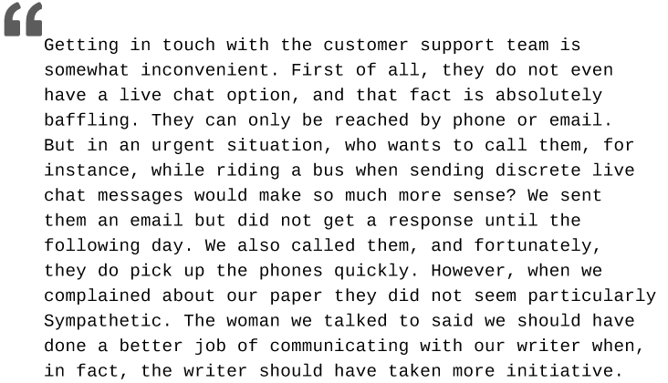 Many displeased users have frequently complained about the site's incompetence in completing assignments with tight deadlines. Some even openly condemned the site and included words like – "they don't deliver work on time," "don't sign up to these frauds," and "don't trust their half-truths and false promises."