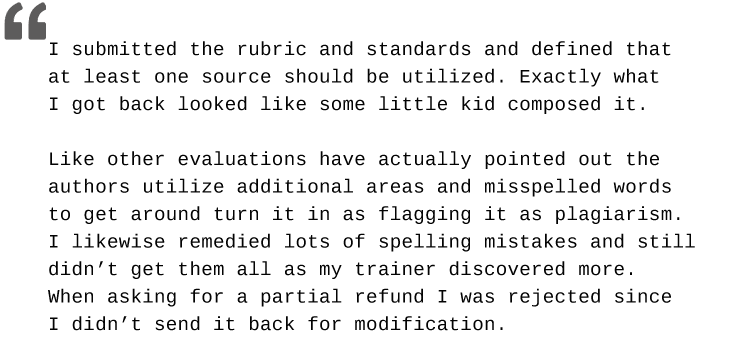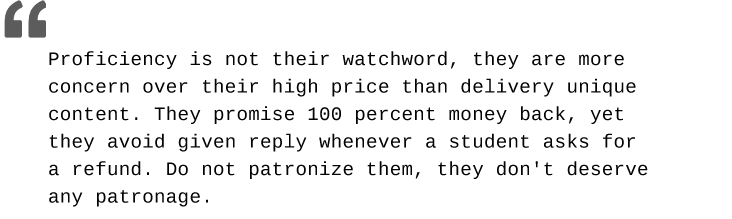 Panel of NON-experts:A handful of users have even shown their abhorrence towards their panel of experts stating they don't know the first thing about writing assignment research papers. And the provided work appeared to be spun content loaded with grammatical mistakes, spelling errors, ill sentence constructions, and so on!