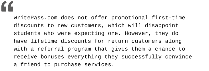 According to ratewritingservices, customers can request for revisions only within seven days after their assignment has been delivered. So if you ask for revisions after seven days, your request will not be approved. Also, you need to prove that your assignment is not perfect and it requires revisions. The reviews in BestBritishwritingcompanies indicate that WritePass.com doesn’t provide any guarantees, discounts or refunds. |