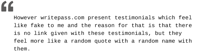 According to TopUKEssays, WritePass doesn’t have what it takes to offer a standard quality essay writing service. One of their writers posted the following review on EssayScam regarding the quality of their work “I am furious. I wrote for WritePass, sent my invoice but they won’t pay me. Also, they say English writers, not true. Liars.” |